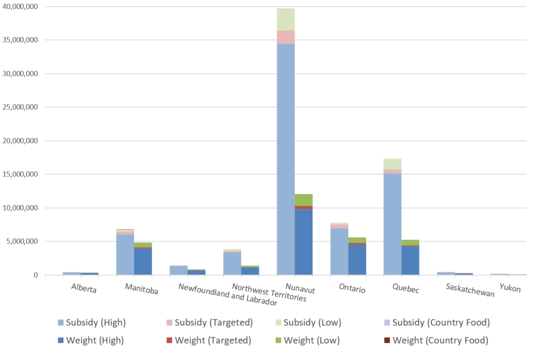 The Baffin Region of Nunavut and Northern Quebec (Nunavik) received 34% and 22% of the total subsidy amount, slightly more than half of the program's subsidy budget. Nunavut alone received a bit more than half of the annual subsidy amount, for a total of 51%. This is explained both by the fact that Nunavut accounts for 40% of the total program population and has the highest average subsidy rate of all Nutrition North Canada regions.