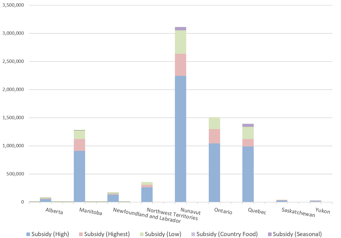 † Quebec North Shore communities are eligible for a subsidy from Nutrition North Canada during the months when there is no marine service to these communities (generally from January to March). Note: Numbers may not add up due to rounding. |