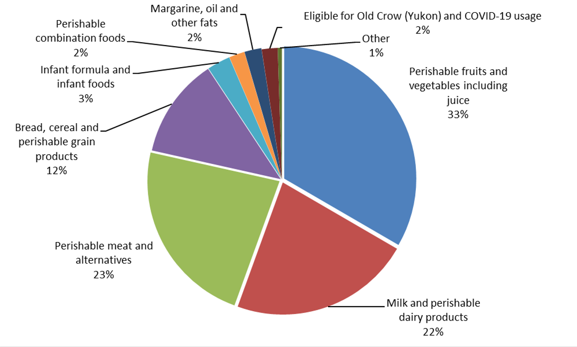 - The ten foods subsidized at the program's medium level accounted for 78% of subsidy - all fresh fruits, meat, all fresh vegetables, bread, frozen potato products, yogurt, eggs, and unsweetened juice of 250ml and less, poultry and bread products.
