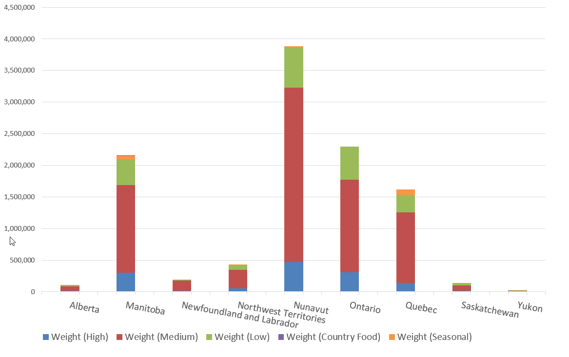 | Province or territory | Weight by Subsidy level (kg) | ||||